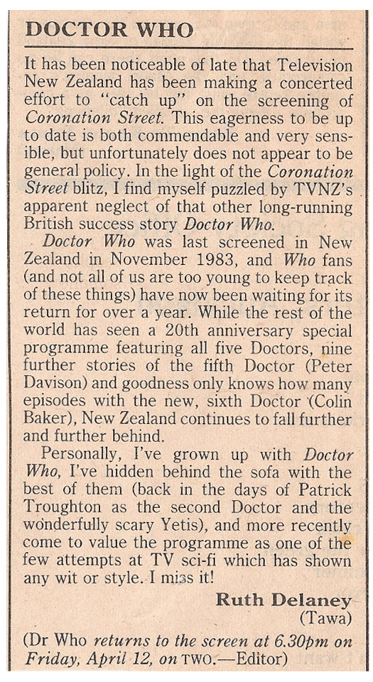 Doctor Who was last screened in New Zealand in November 1983, and Who fans (and not all of us are too young to keep track of