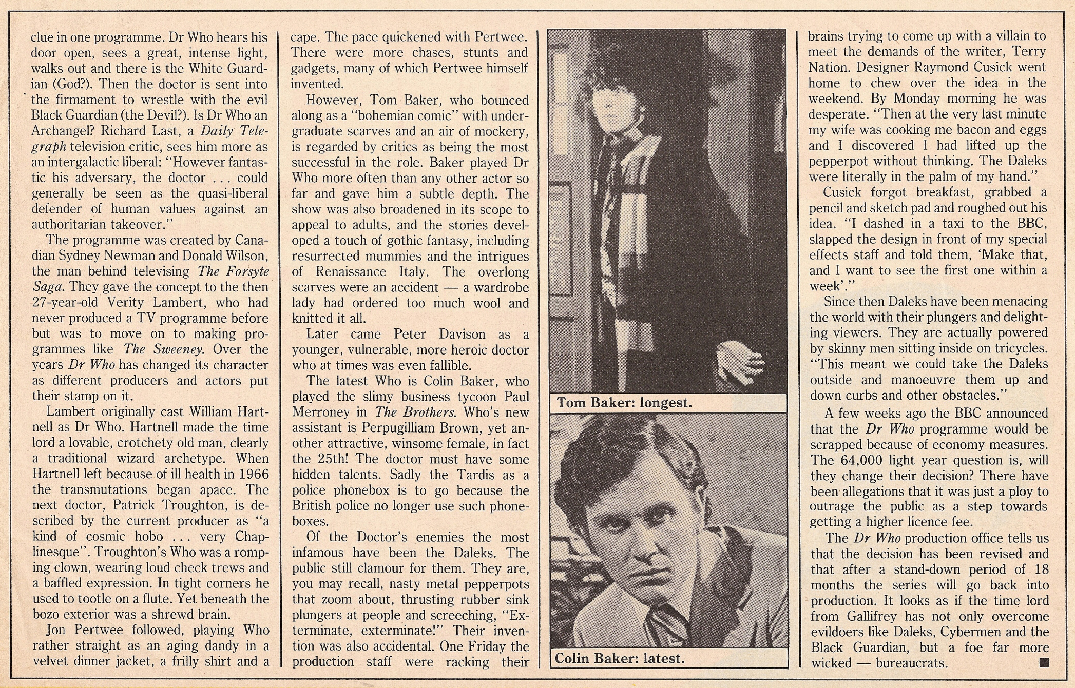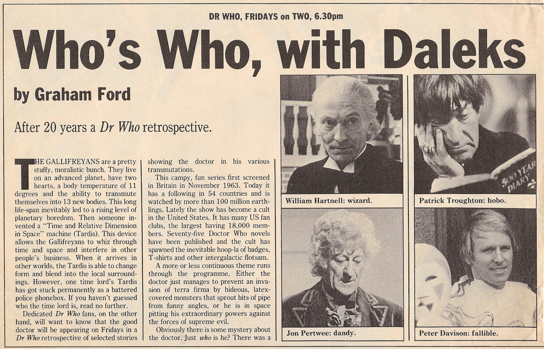 p94-95: Article Who's Who, with Daleks by Graham Ford, with photos (b/w) of the first five Doctors and Colin Baker