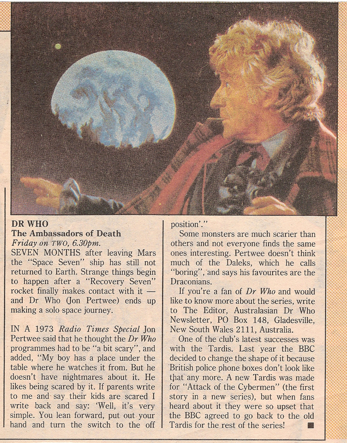 If you're a fan of Dr Who and would like to know more about the series, write to The Editor, Australasian Dr Who Newsletter, PO Box