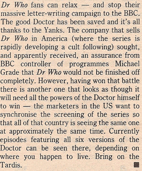 thanks to the Yanks. The company that sells Dr Who in America (where the series is rapidly developing a cult following) sought, and apparently received,