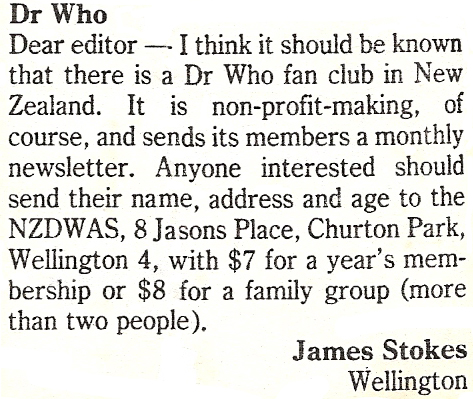 Dear editor - I think it should be known that there is a Dr Who fan club in New Zealand. It is non-profit-making, of course,