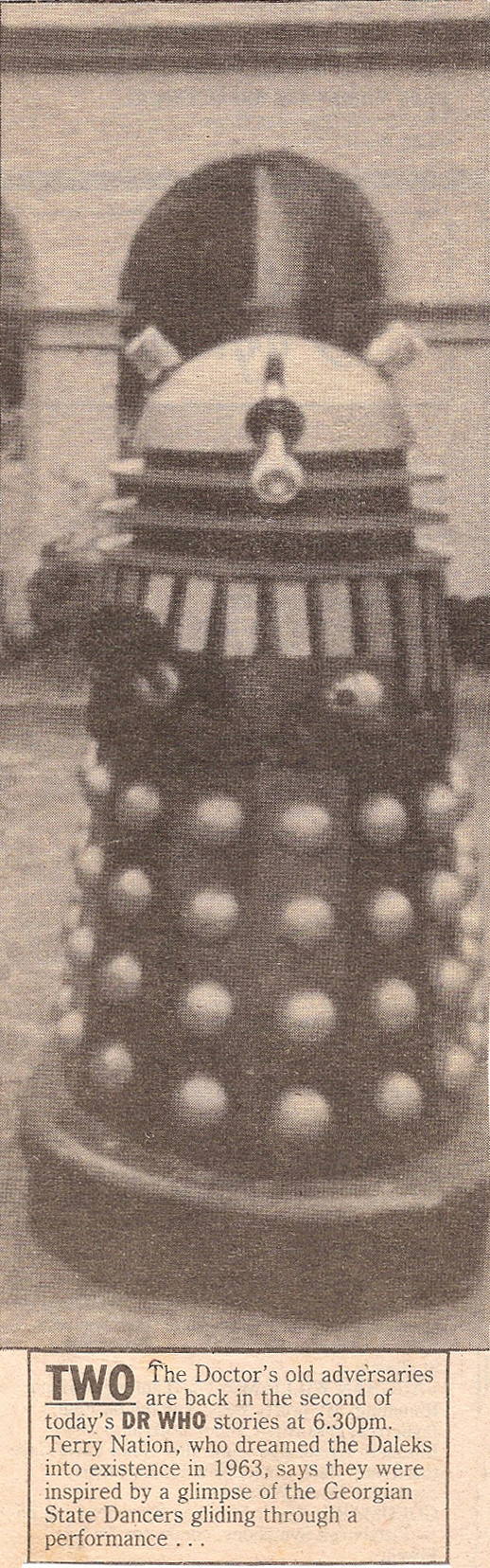 TWO The Doctor's old adversaries are back in the second of today's DR WHO stories at 6.30pm. Terry Nation, who dreamed the Daleks