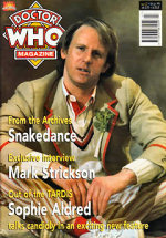 The Mark Strickson interview credits Jon Preddle and myself with supplying additional material. DWM's own interview apparently yielded very few anecdotes regarding Mark's time as Turlough, so TSV supplied DWM with passages from our interview with Mark conducted in 1990. The comic strip is a one-off tale that slots neatly into the continuity of 1993's Emperor of the Daleks strip, and is unusual in that all seven pages are a conversation between the Sixth Doctor and Davros within the confines of the TARDIS's cloisters. Philip MacDonald's highly insightful articles for DWM each examine a single aspect of Doctor Who in the context of the show's entire run. This issue's subject exposes the varied alien environments seen in the series. Interesting to see how many planets correspond to one of four types: desert, jungle, fire and ice. Out of the TARDIS is a new feature in which celebrities are given twenty random questions to answer. The questions are mostly unrelated to Doctor Who, so for a change the interview ends up being more about the person's own life and interests. Not being much of a follower of the show's actors, this isn't to my liking, but it is nice to see what Sophie Aldred (the first subject) looks like now. Another great Davison story, Snakedance, is the Archive subject. Doctor Who Magazine 228 (2 August 1995)